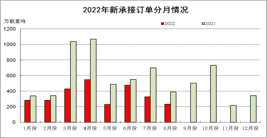 1~8月,50家重点监测的造船企业完工出口船2071万载重吨,同比下降15.9%;承接出口船订单2494万载重吨,同比下降42.9%;8月末手持出口船订单9001万载重吨,同比增长12.2%。出口船舶分别占重点造船企业完工量、新接订单量、手持订单量的90.4%、94.8%和91.1%。