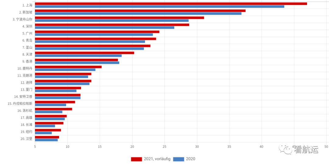·排名前10位的伙伴国所贡献的交易量约占汉堡集装箱装卸总量的61%。中国历来是汉堡最强大的贸易伙伴。2020,汉堡和中国(包括中国香港)之间的货物往来共计240万标准箱。美国与汉堡的集装箱运输量排名第二,并在2020年达到新纪录。与英国之间的集装箱运输呈上升趋势,达到了26.6万标准箱的新纪录。图为2021 集装箱货运总量(单位:百万标准箱)。图源:汉堡港官网