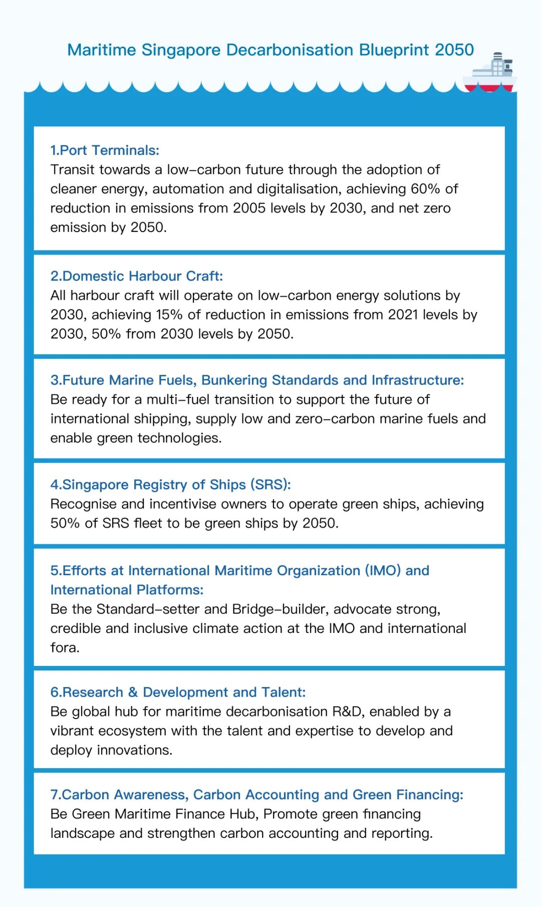 为促进新加坡海事业的可持续发展,进一步强化其全球领先的海事中心地位,近日,新加坡海事及港务管理局根据联合国《2030年可持续发展议程》、《巴黎协定》以及国际海事组织《国际海运温室气体减排初步战略》的相关内容,制定了新加坡2050脱碳蓝图。以下是蓝图的总结性内容(含中英文):