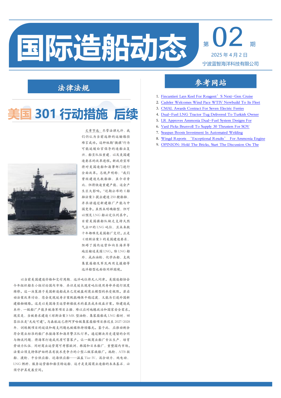 本期将通过船舶动态、新技术以及法律法规三个方面来呈现全球造船工业多维度的发展态势。