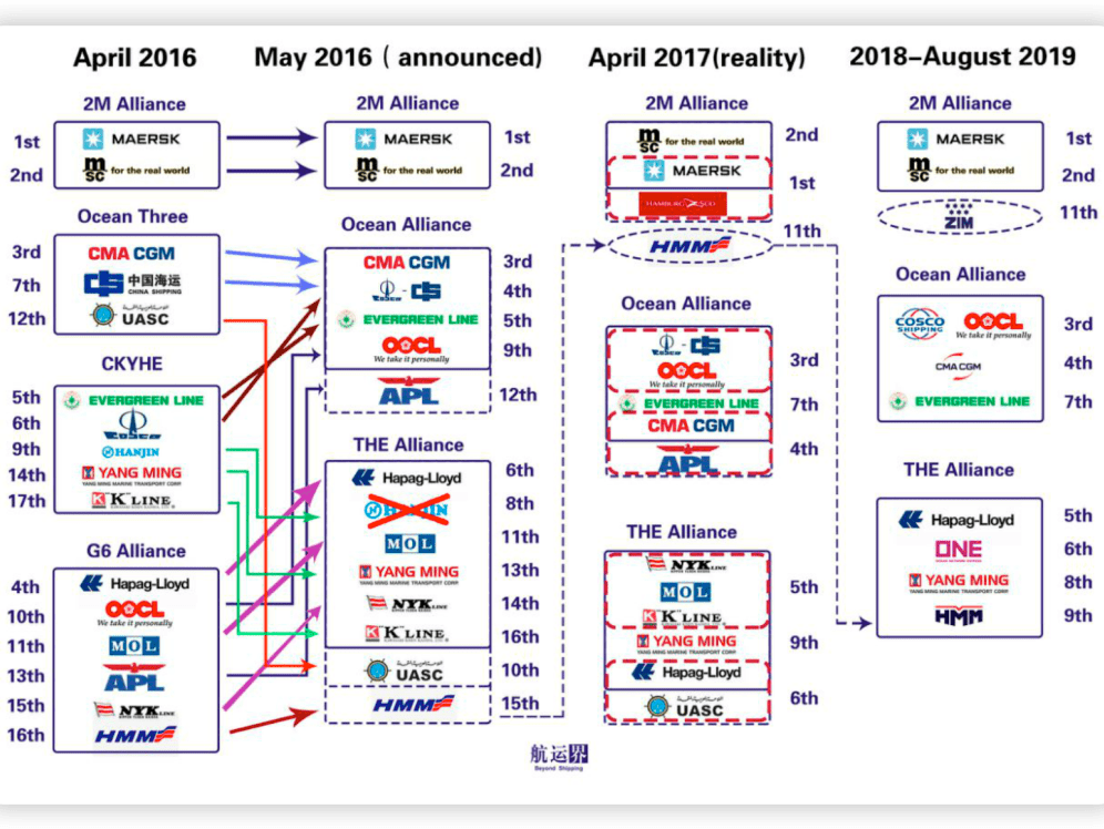 Tips:20世纪90年代以来,集装箱航运业供需矛盾日益尖锐,船公司为了增加挂靠港、拓展物流服务范围,纷纷走上了大规模联营道路,通过舱(箱)位互相协议、码头共享等形式进行联合经营。此前,九大船公司通过签署VSA协议组成了三大航运联盟,占据全球集装箱市场的80%。它们分别为:2M联盟——马士基航运、地中海航运;海洋联盟(Ocean Alliance)——中远海运、法国达飞、长荣海运、东方海外;THE联盟(THE Alliance)——赫伯罗特、海洋网联船务、现代商船、阳明海运。随着2M联盟正式宣布终止,其他航运联盟的命运与整个行业格局都势必迎来巨变。